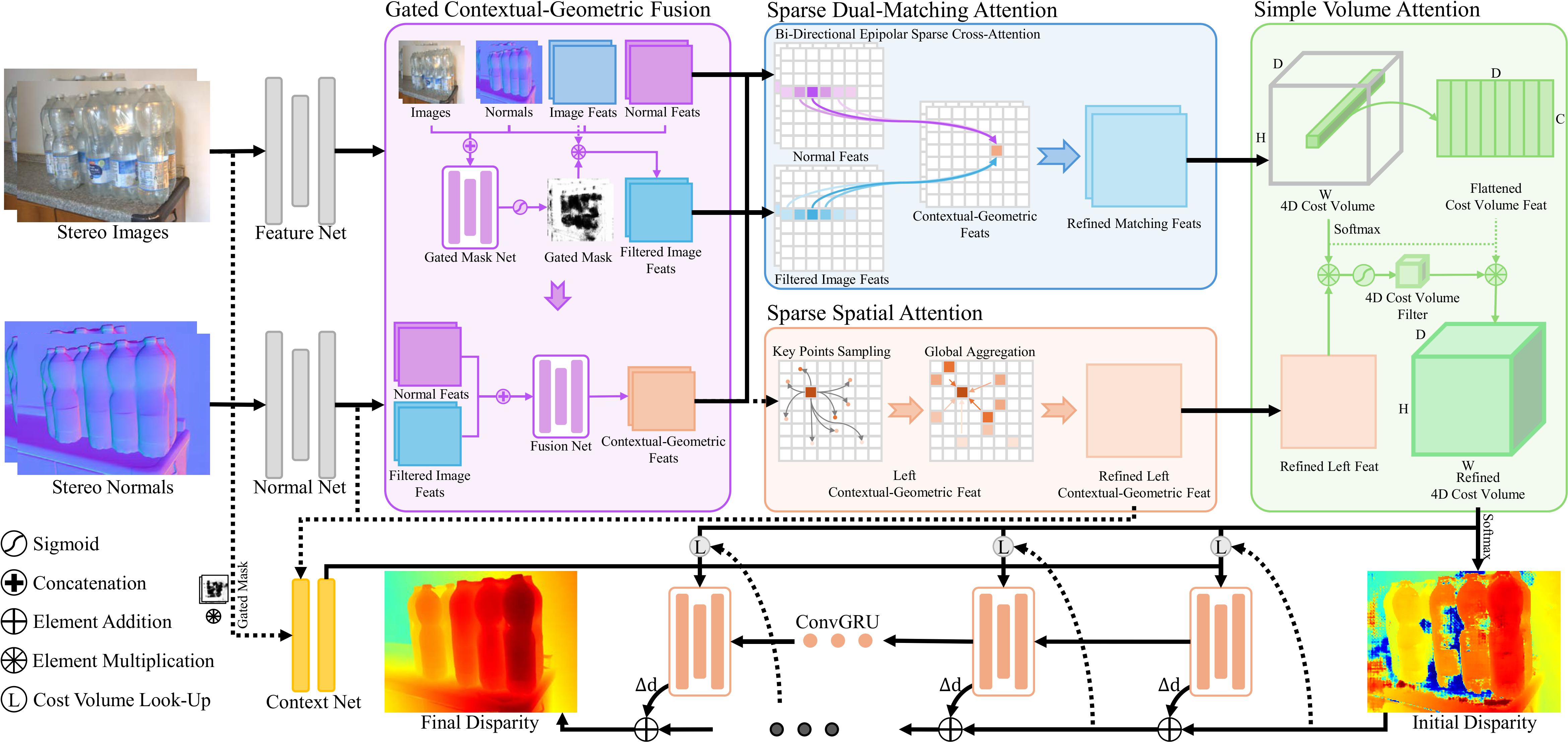 Geometry Reinforced Efficient Attention Tuning Equipped with Normals for Robust Stereo Matching Jiahao LI, Xinhong Chen, Zhengmin JIANG, Cheng Huang, Yung-Hui Li, Jianping Wang Paper | Code | Cite We propose a universal framework (GREATEN) that can be seamlessly integrated into existing iterative stereo matching methods to optimize the Synthetic-to-Realistic (Syn-to-Real) zero-shot generalization in both regular and ill-posed regions. The GREATEN framework employs three well-designed sparse-attention mechanisms integrated with Gated Contextual-Geometric Fusion (GCGF) module and Specular-Transparent Augmentation (STA) strategy to efficiently fusing the image-features and surface normal-features for improving the Syn-to-Real generalization. |